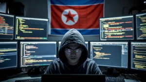Image depicting crypto-stealing malware hackers at work with a North Korea flag in the background / Threat actors linked to North Korea, posing as Web3 recruiters, are targeting job seekers to install crypto-stealing malware on their devices.