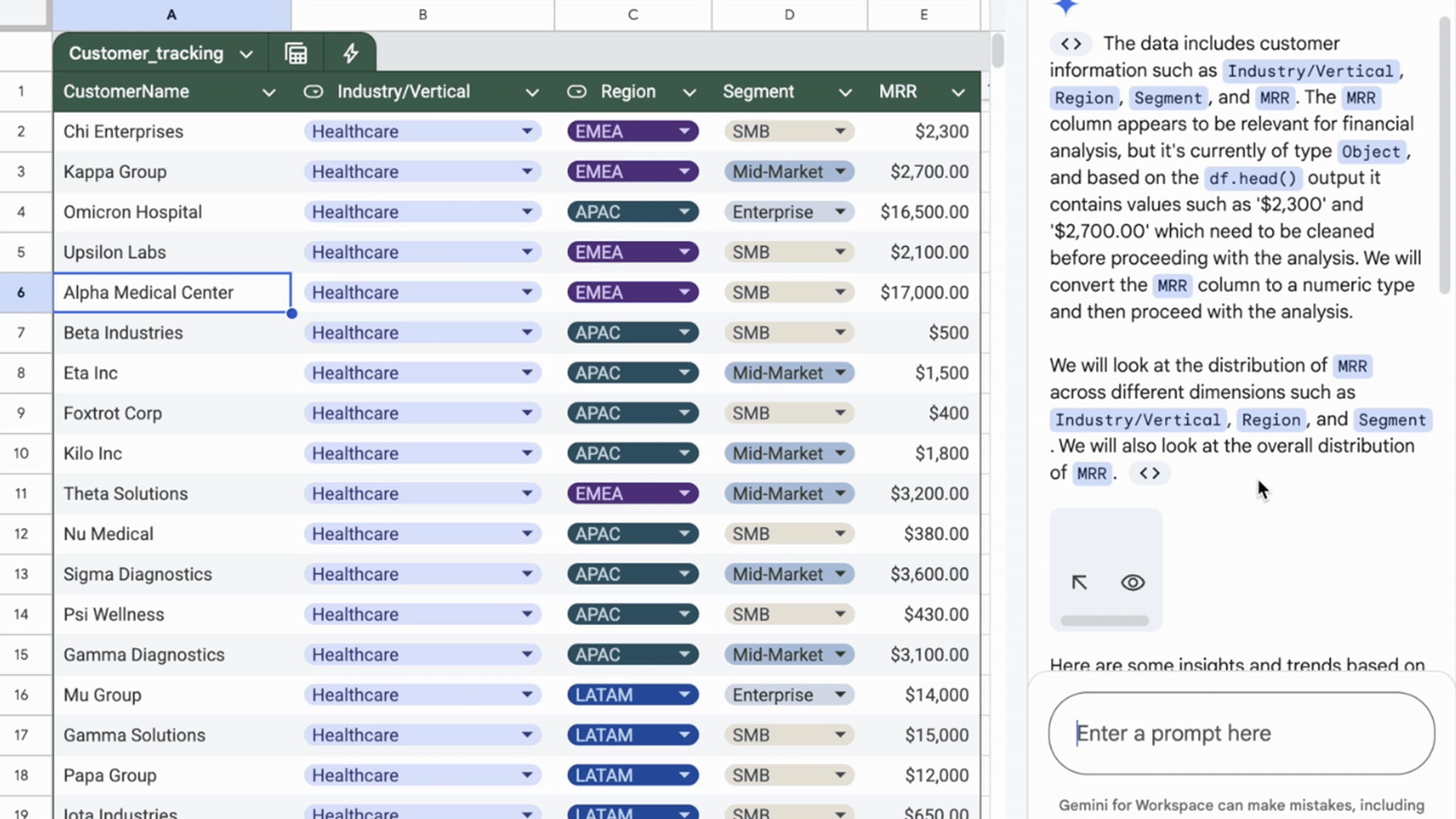 Tapping the brand new “Analyze for insights” shortcut in Sheets will immediate Gemini to supply insights on “contextual developments, patterns, and correlations between totally different variables in your knowledge,” in response to Google. The agent may also create charts primarily based in your knowledge, which you’ll be able to insert as static photos in your doc. Relying on the complexity of the immediate, Gemini will use Python code to finish the request.